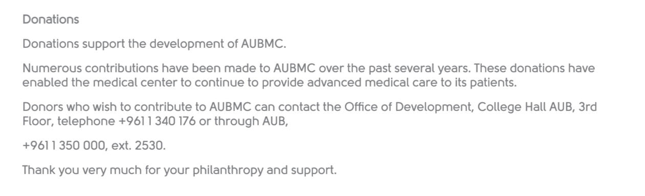 For this one, please select "I would like to select another designation and/or split my gift" and then look for areas for the AUBMC, either "AUBMC 2020" or for the disaster relief fund for the hospital specifically, you might have to select multiple just make sure they get it.In case that doesn't work, here is a screenshot I took from their main website: